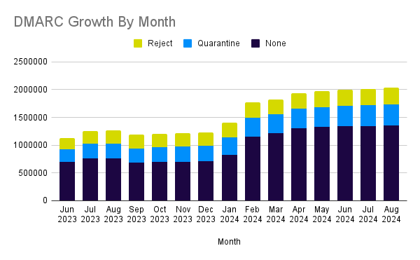 What do we see when we exclude p=none to look for domains that have implemented a better, more restrictive DMARC policy? The good news is that the data shows that even through this view, DMARC adoption continues to grow. The jump near the start of the year was much smaller, but it’s still there, and adoption continues to grow, month over month.